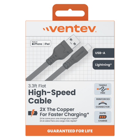 - Ventev - Ventev Chargesync Flat USB A to Apple Lightning 3.3ft - Boxed by Ventev Regular price $19.99Unit price /Unavailable- 2 colors available In stock