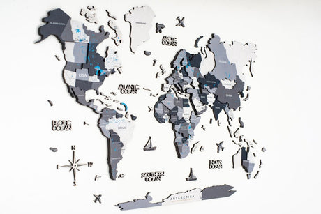 24" X 39" Black Gray and White Wood World Map Hanging Dimensional Sculpture