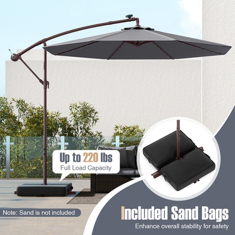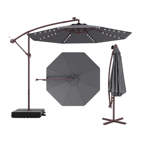 10 Feet Solar Offset Hanging Umbrella with Base and LED Lights-Gray by DirectDeals