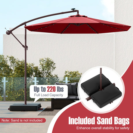 10 Feet Solar Offset Hanging Umbrella with Base and 32 LED Lights-Wine by DirectDeals
