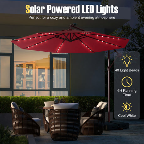 10 Ft Patio Umbrella Offset Cantilever Umbrella with 40 Solar Powered Lights-Red by DirectDeals