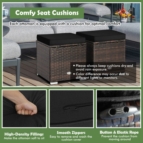 2 Pieces Outdoor Patio PE Wicker Ottomans with Removable Cushions-Brown