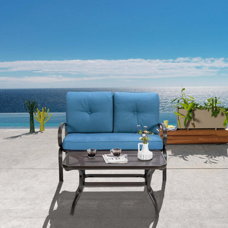 2 Pieces Patio Loveseat Bench Table Furniture Set with Cushioned Chair-Blue