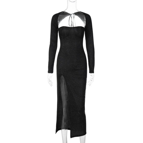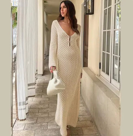 Elegant Sheer V-Neck Knitted Beach Dress – Long Sleeve Cover-Up for Summer & Fall