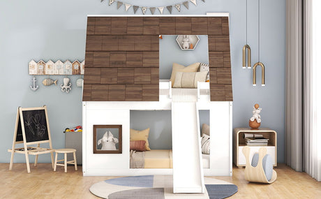 Wood Twin Size House Bunk Bed With Roof, Ladder And Slide - White / Brown by Couch.com