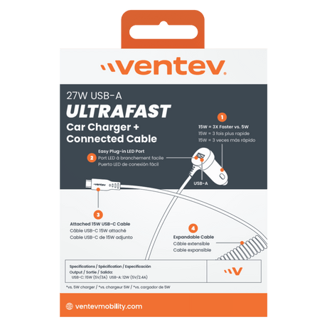 Ventev 27W ULTRAFAST Car Charger and USB-C Connected Cable by Ventev