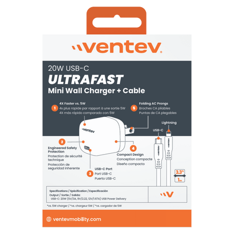 Ventev 20W ULTRAFAST USB C Universal Mini Wall Charger and USB C to Apple Lightning Cable by Ventev