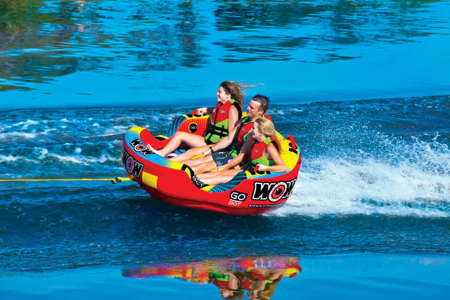 Get going on the water with the Go Bot Towable from WOW.  Designed with family fun in mind the Go Bot makes a great towable for the youngest to the oldest in the family.  Ride in the seated position from the front tow point or connect the rope to the back tow point and ride chariot style.  The deep cockpit seating with high backrest makes the riders feel more secure while the drop speed bottom glides smoothly over the water creating less drag on the boat and therefore better gas mileage.  Our new slotted EZ entry system makes it easier than ever to get back on the towable if you do happen to get thrown out of it.  The Go Bot will be loved by everyone in the family; from those that like a nice and easy ride to those that want something more extreme.