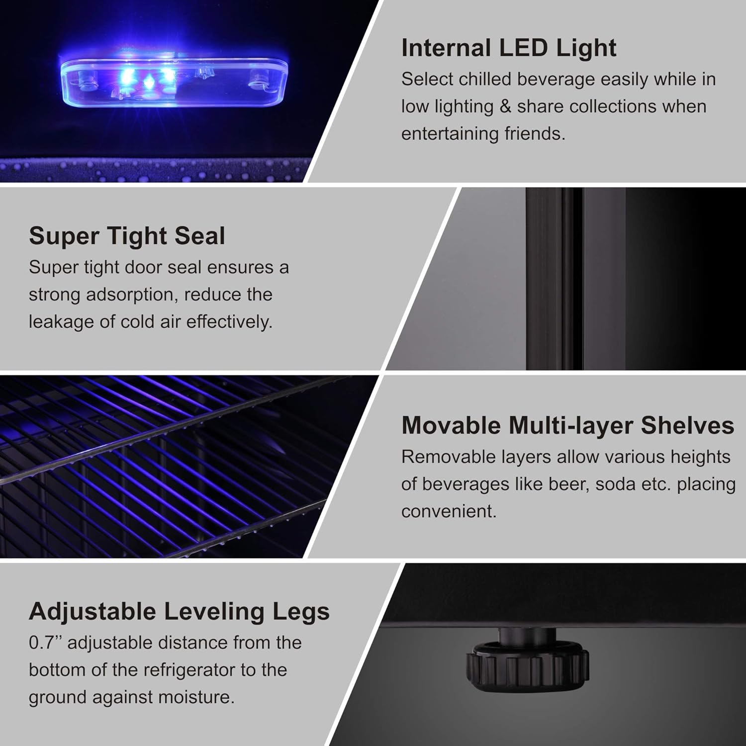 【Mute system】-The beverage fridge with clear door is equipped with an advanced cooling system that can maintain the beverage at the appropriate temperature under extremely low noise conditions, and even the volume during cooling will not disturb your sleep. It is equipped with a movable black shelf, black glass door, and adjustable leveling legs. Convenient for customers to move beverage cabinets.