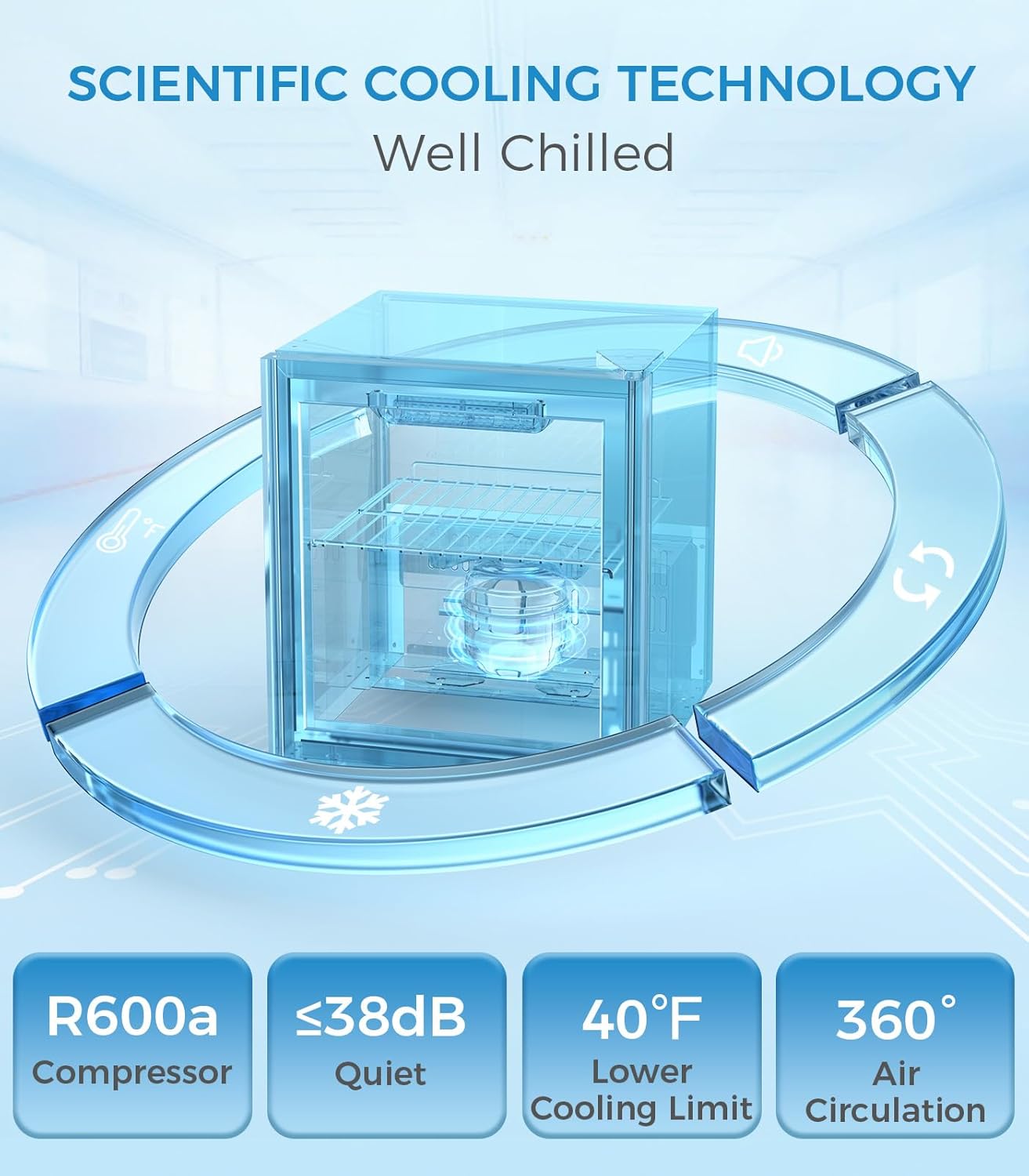 【Fashionable and portable】- This beverage refrigerator has an elegant appearance, rich features, and low noise system, 17.99 × 17.52 × 19.69 inches beverage cooler is your preferred choice for bedrooms, offices, dormitories, and more. The design of reinforced glass doors with airtight seals can maintain the optimal humidity level.