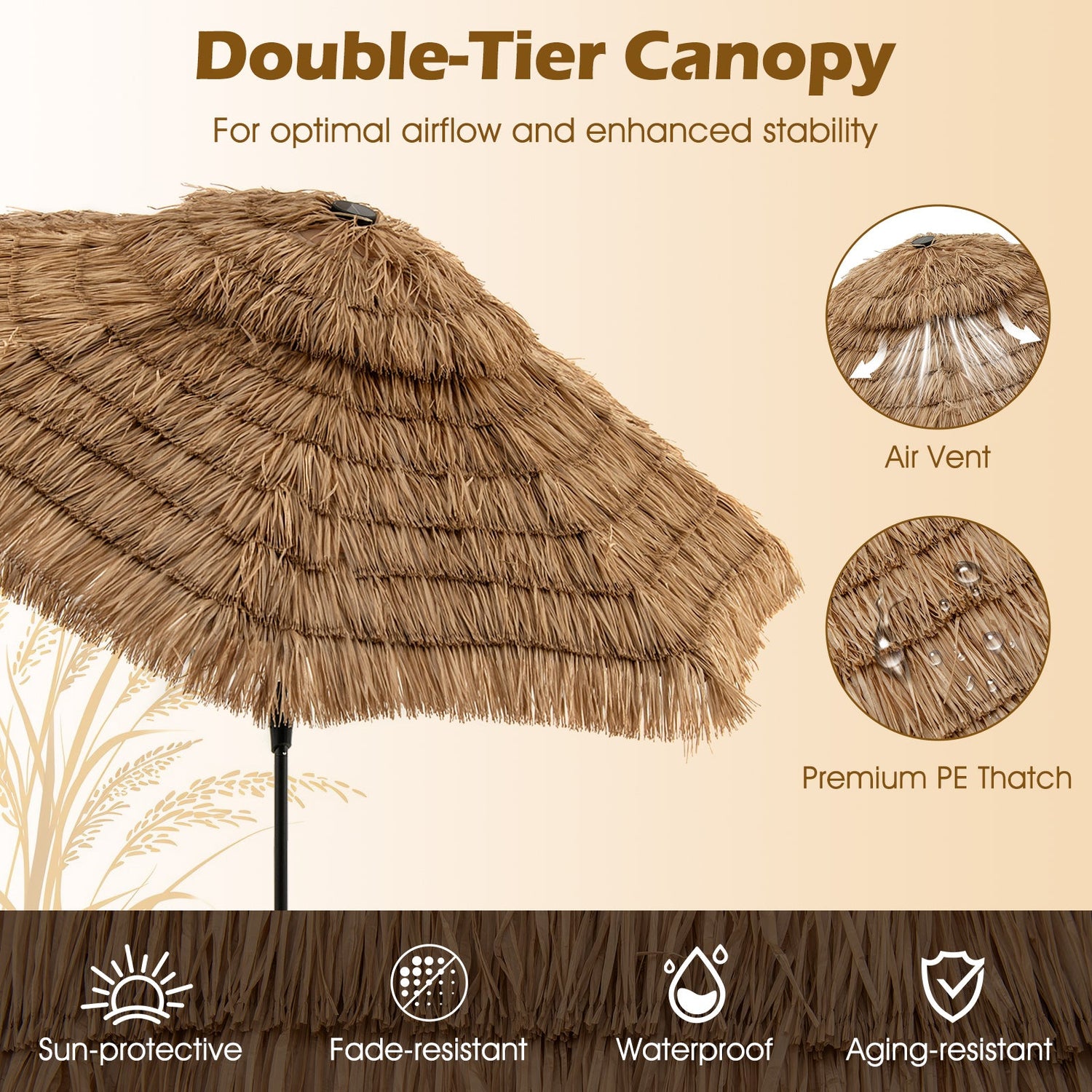 ● 32 led lights and a center light can be switched with a button on the rib● 11 tier thatched covered on the canopy to provide better shading● Equipped with manual crank to open and close the umbrella● Umbrella can be adjusted from 0-30° to block sunshine from different directions● Energy saving solar panel support both day and night use● High-quality PE and polyester fabric is fade-resistant and waterproof● 8 ribs and steel pole with rust resistant finish ensure high stability● Double-vented top maintain fresh and cool air under the umbrella● Simple structure of the 2 section pole ensure quick installation● Hawaiian style thatched umbrella suitable for various occasions● Please use the umbrella with a stand (Note: Umbrella stand is note included in the package.