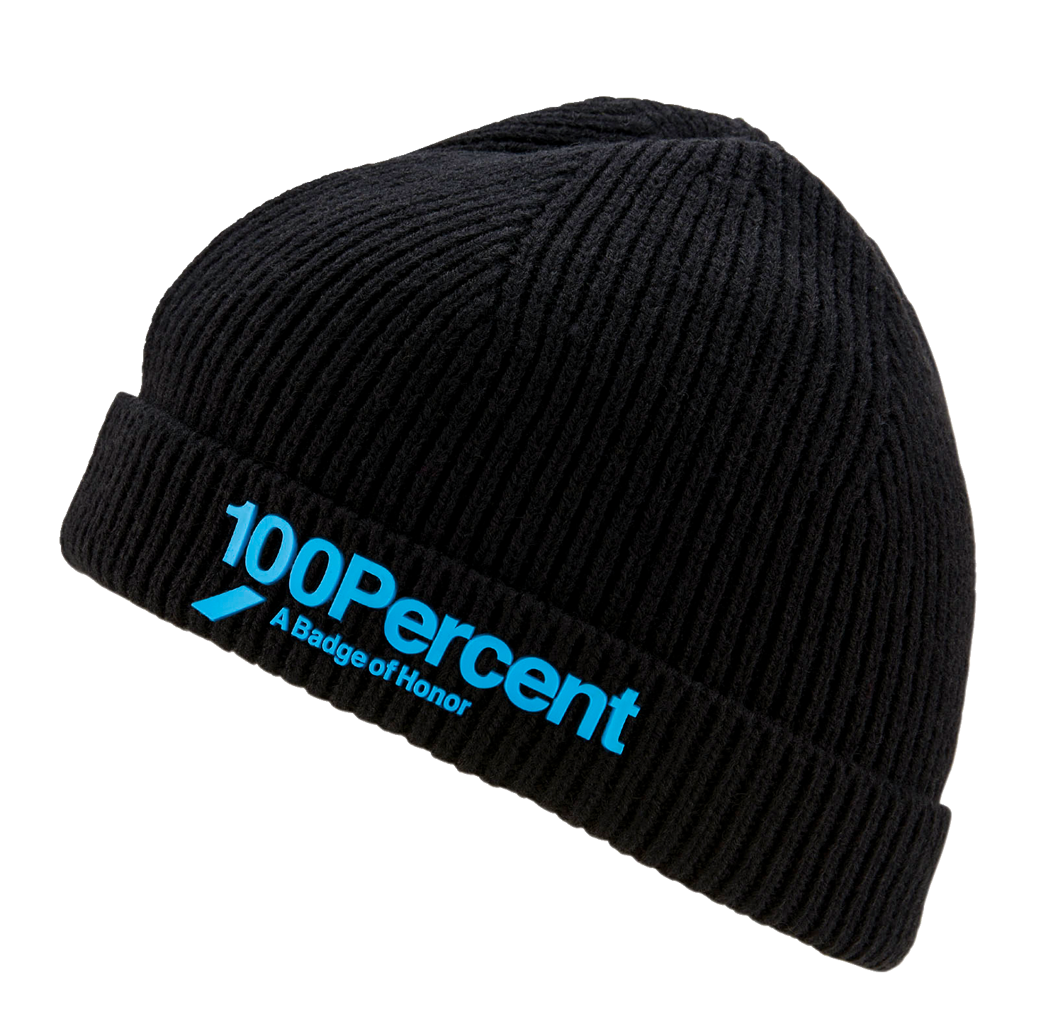 - Acrylic yarns with a raised sonic weld logo; traditional cuffed beanie