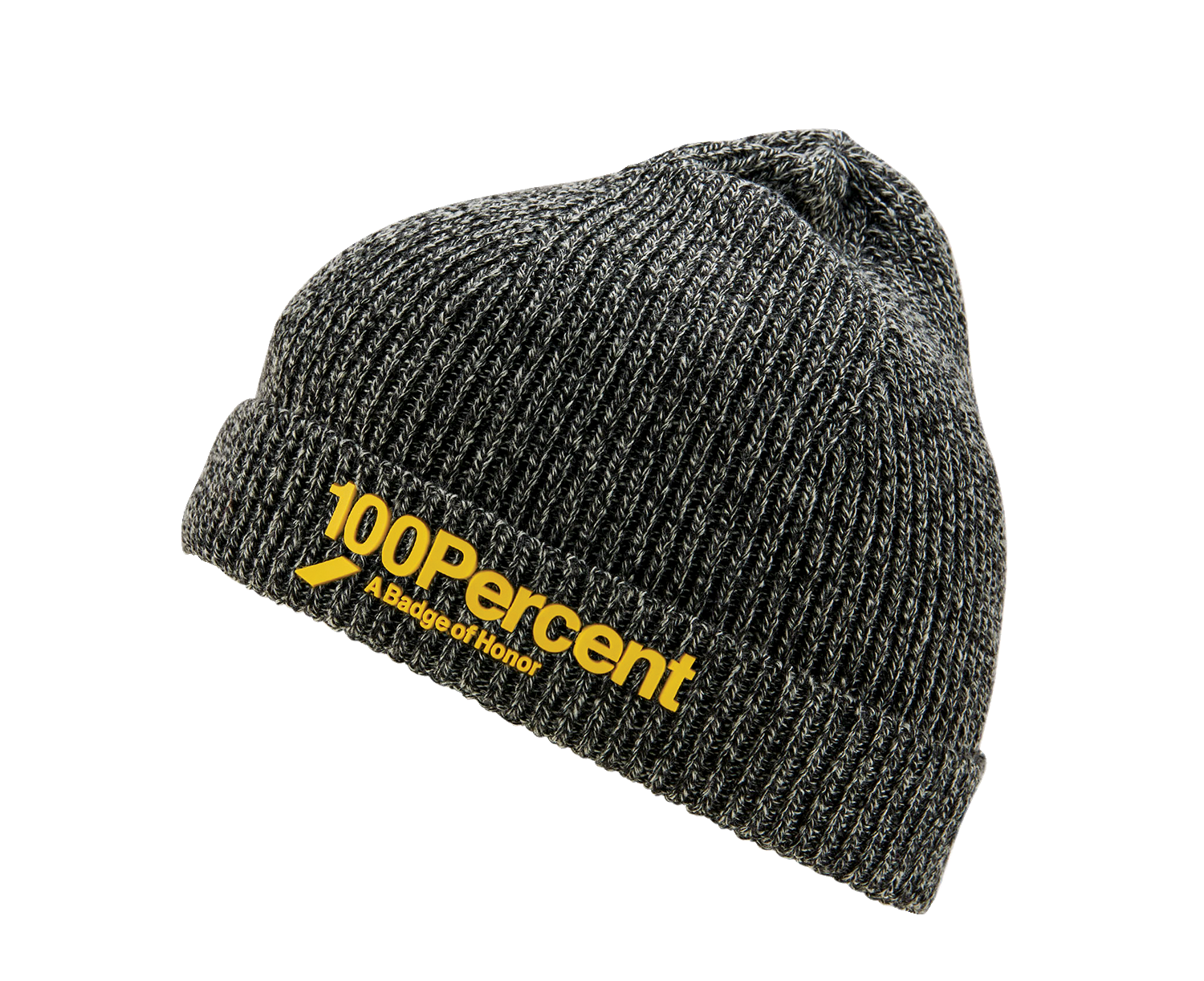 - Acrylic yarns with a raised sonic weld logo; traditional cuffed beanie