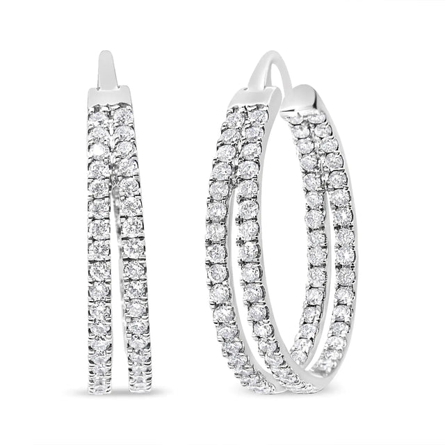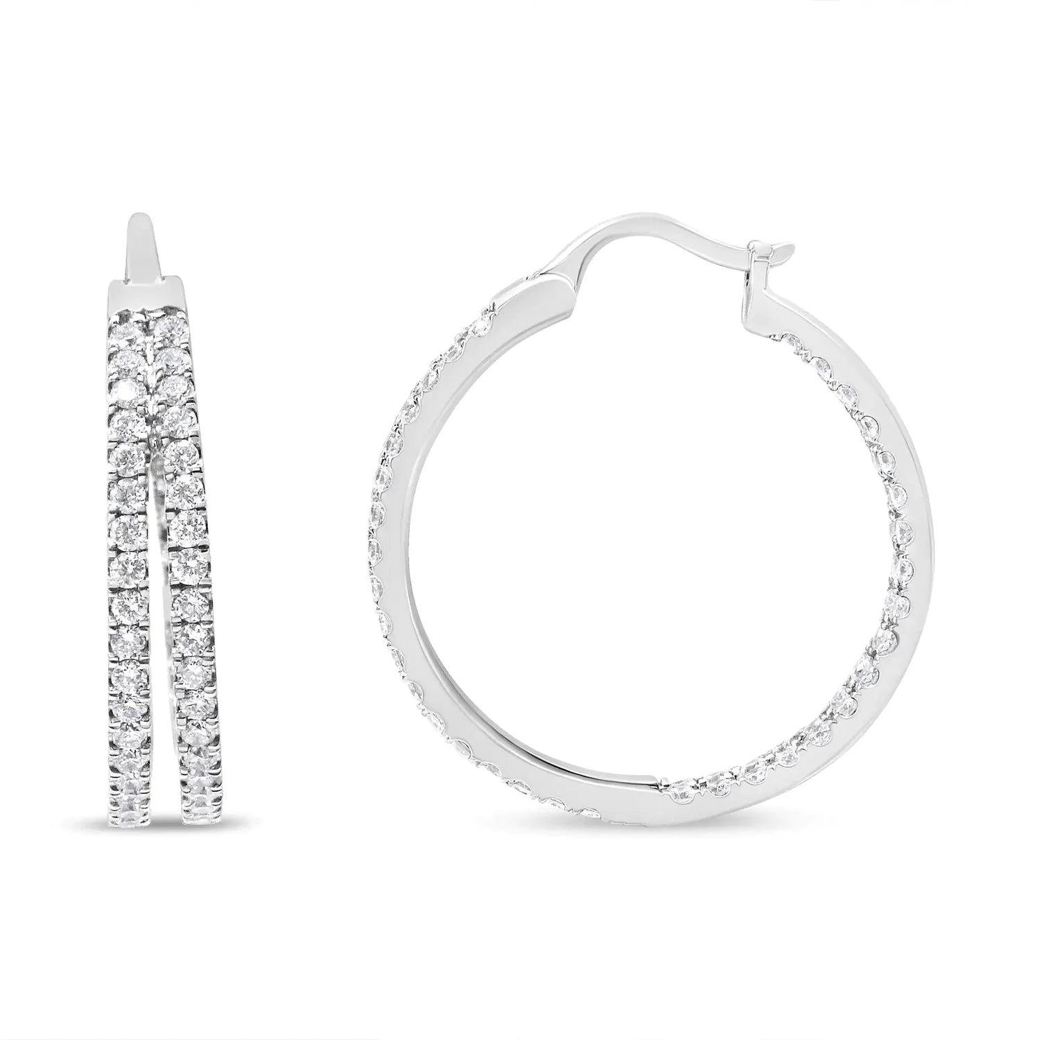 Steal the spotlight with these stunning diamond hoop earrings. Created in cool 10K white gold, each clever double-row hoop showcases layered ribbons sparkling with lab grown diamonds along the outside front and inside back edge. Captivating with 1 1/2 cts. t.w. of diamonds and a bright polished shine, these earrings secure with a snap post. Earrings will hang approximately 3/4 inch down from your earlobe.