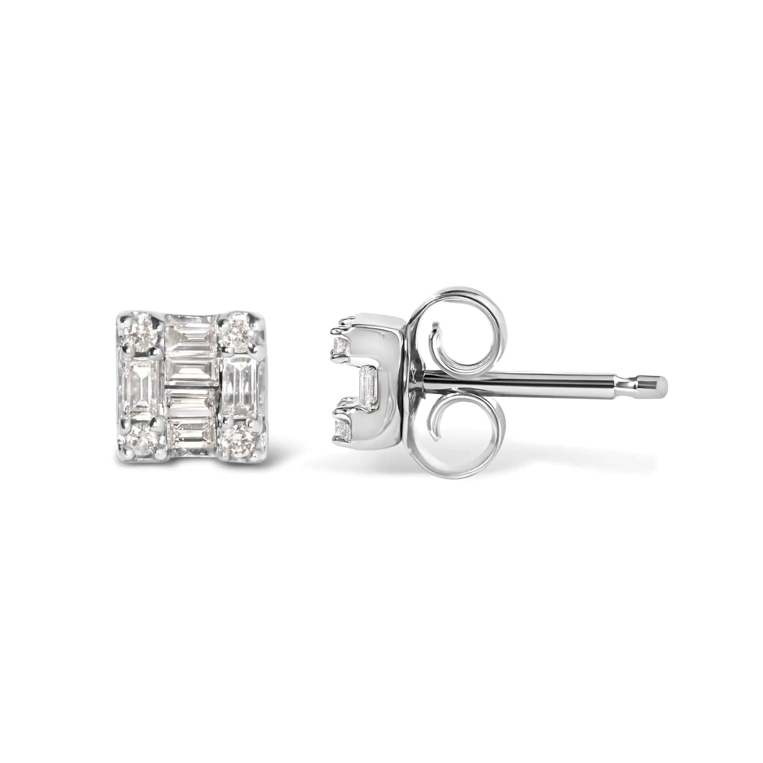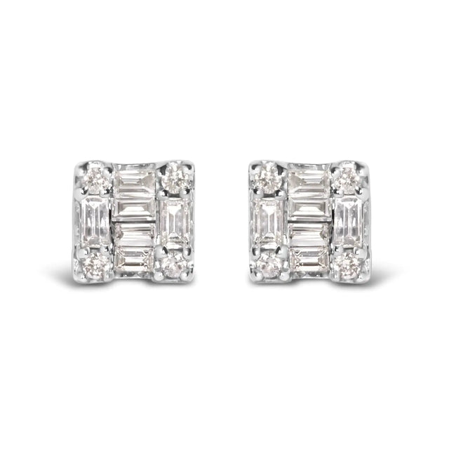 10K White Gold 1/7 Cttw Round and Baguette Diamond Mosaic Square Stud Earrings (H-I Color, I1-I2 Clarity)