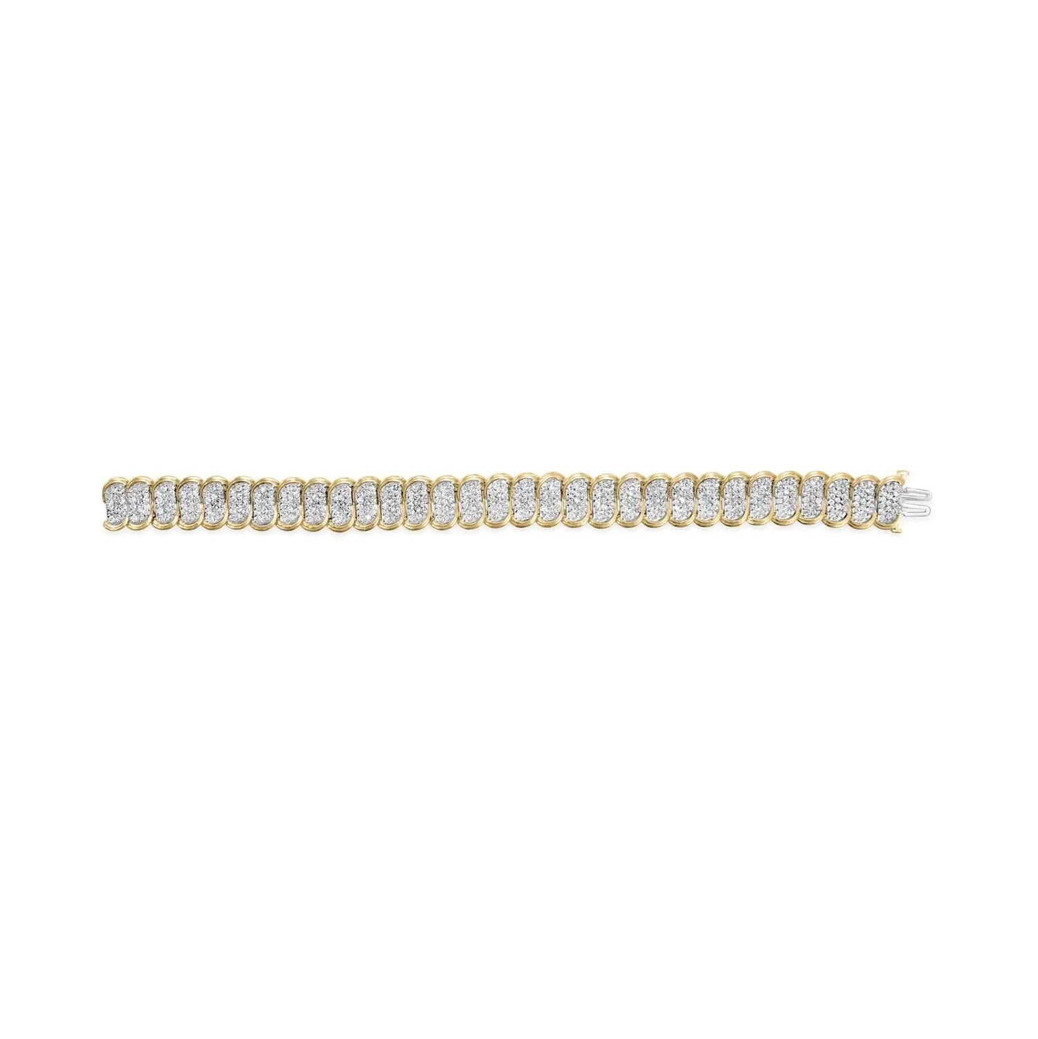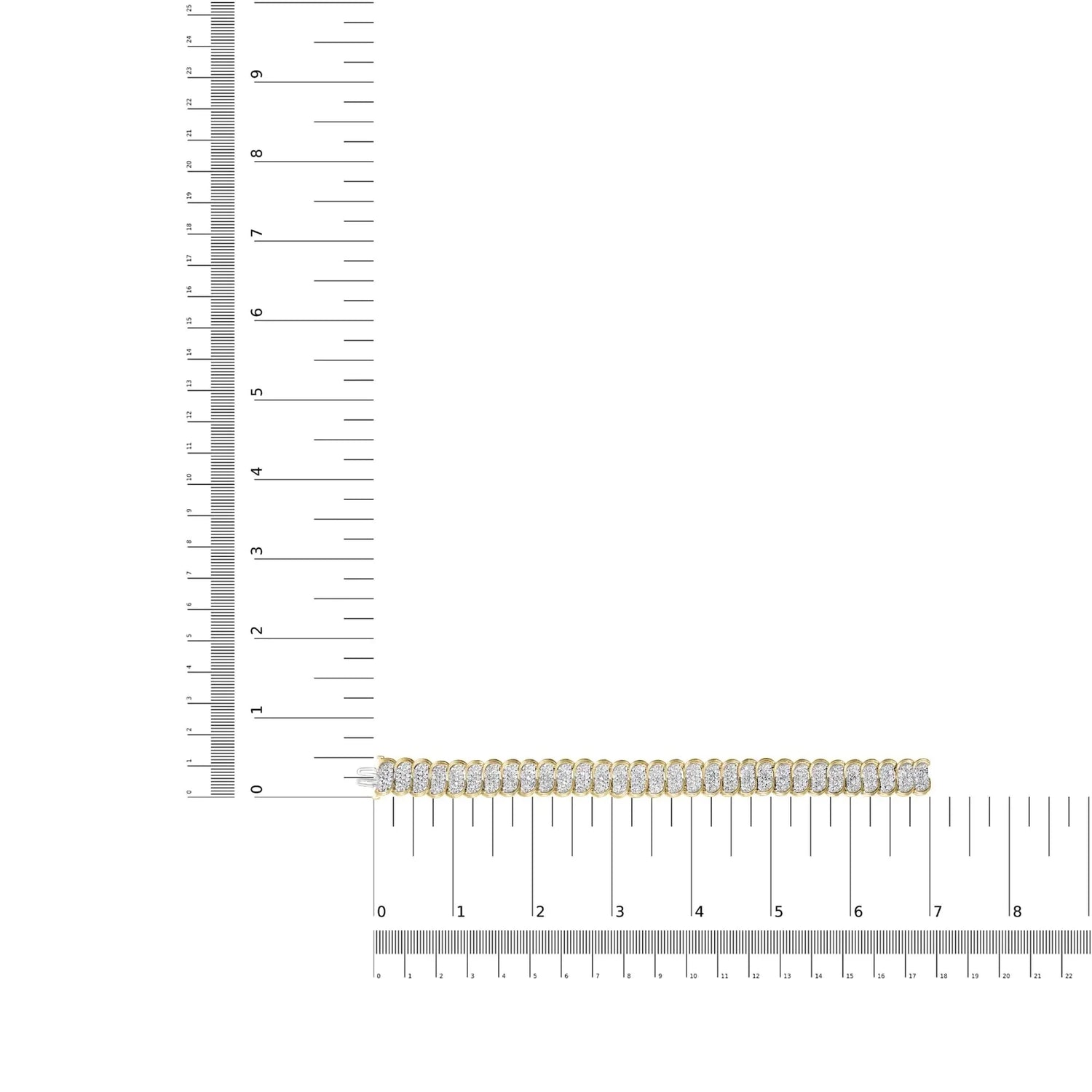 Embark on a journey of elegance with this unparalleled bracelet, where the radiance of 10k yellow gold meets the serene sheen of white rhodium in an opulent dance of contrasts. This piece artfully combines alternating bands of metal to cast a spell of luminosity and texture, setting the stage for its true stars: the round-cut natural diamonds. These gems, totaling 5 carats, are nestled within oval-shaped links, their brilliance enhanced against the cool backdrop of white rhodium. Each 13-millimeter link is a testament to bold design, yet offers a presence on the wrist that's both significant and gracefully fluid. This bracelet is a symphony of meticulous craftsmanship, with each diamond set to catch and refract light, creating a continuous ribbon of sparkle. The juxtaposition of warm gold with cool rhodium strikes an elegant balance, making this piece a timeless treasure. Its seamless design is complemented by a discreet box clasp, ensuring the pattern flows uninterrupted. More than an accessory, this bracelet is a celebration of luxury, designed to elevate any attire with its mesmerizing allure and sophisticated charm, perfect for wrists up to 7 inches.