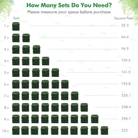 —� High-density Peanut Leaf Panel: It is worth mentioning that 12 tiles of 20" x 20"(32.3 square feet) artificial hedge panels feature a height of 1.5" and 4 layers of leaves for a more lush and realistic appearance. By strategically placing artificial fences in areas that may be exposed  you can Home & Gardenate your house while ensuring personal privacy.