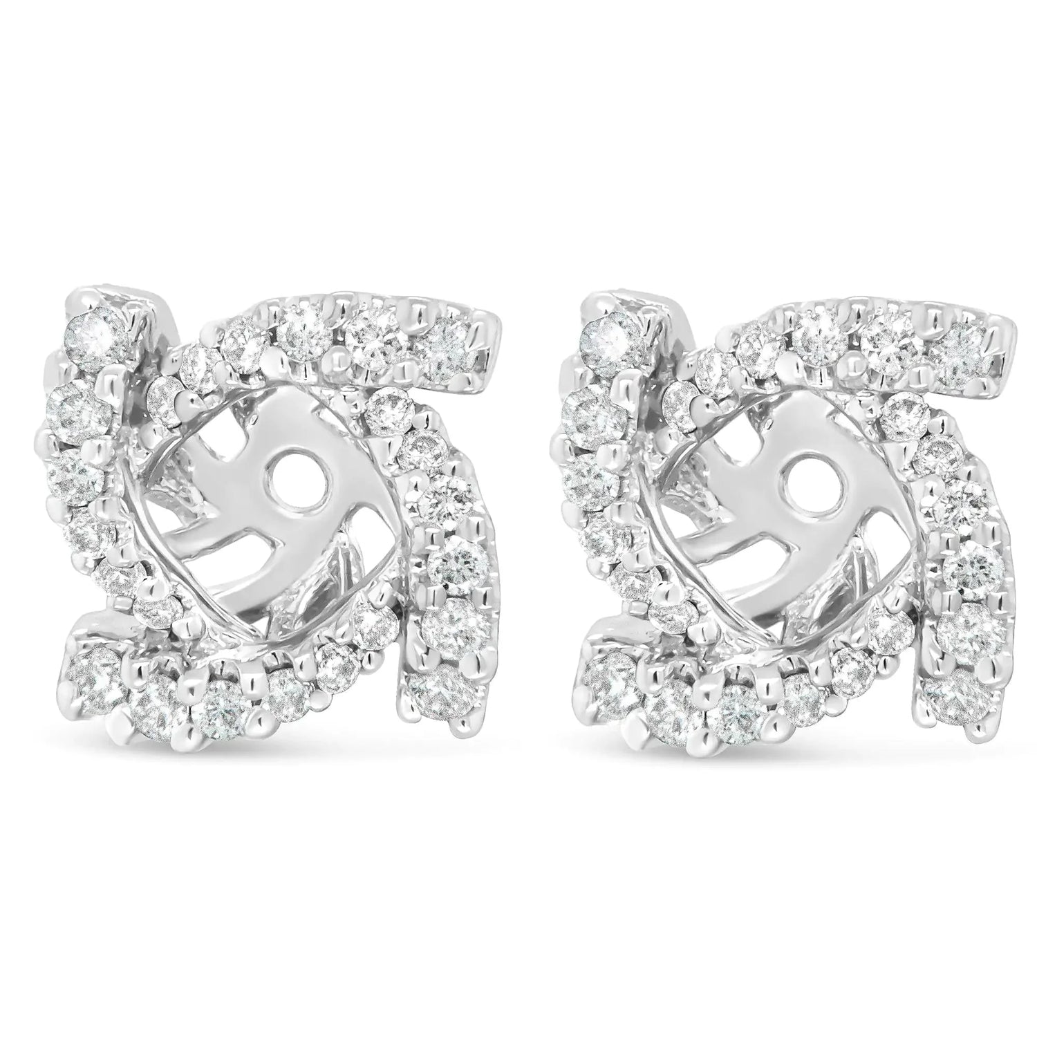 Your favorite pair of diamond studs deserves a fresh new look and you can have it all with these gorgeous diamond earring jackets, made especially to fir your 4mm round stud earrings. A captivating spiral effect encircles your existing studs in sparkling splendor, comprised of round white diamonds in prong settings. These diamonds total 1/3 cttw with an approximate G-H color and VS2-SI1 clarity. This stunning piece is made from genuine 14k white gold, a metal that will stay tarnish-free for years to come!