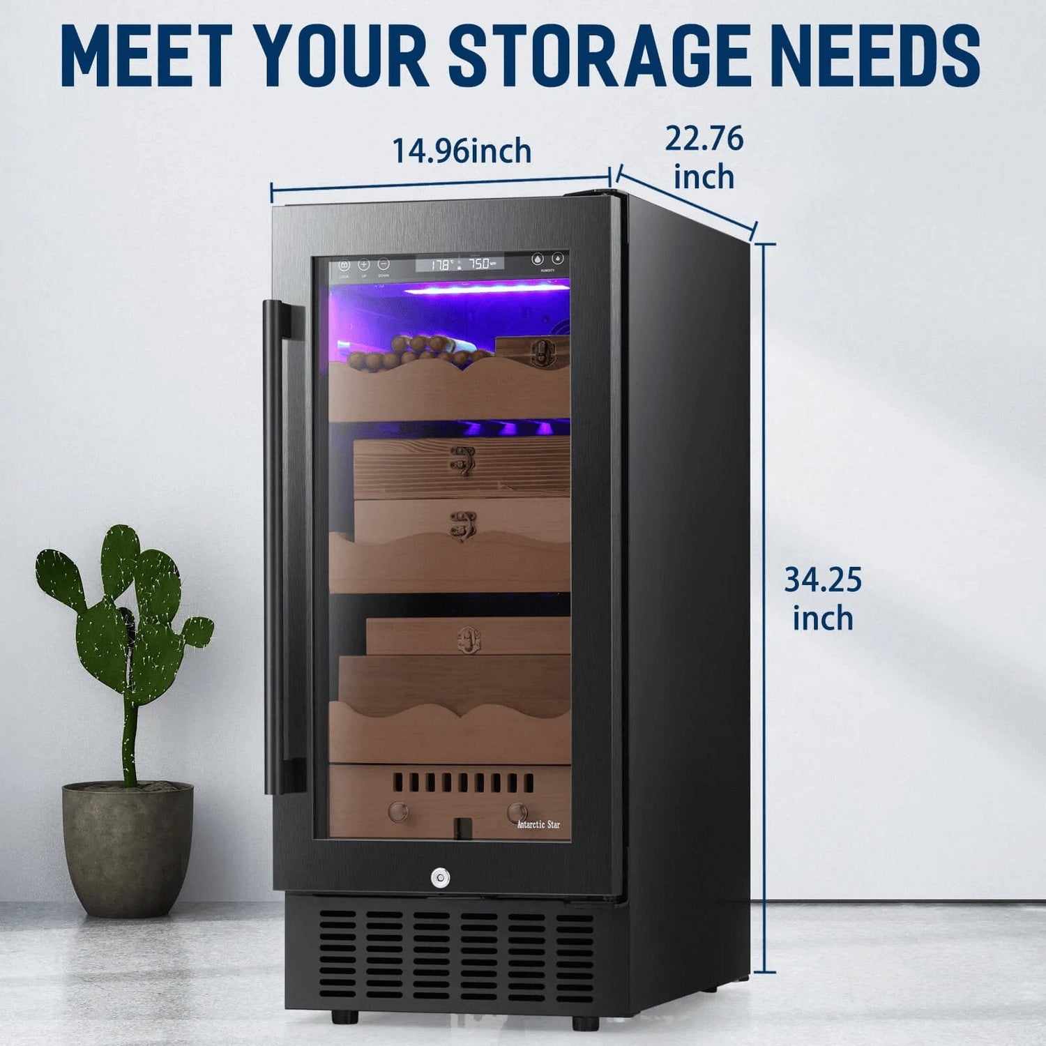 15” BUILT-IN CABINET & Adjustable Shelves- This humidor provide 2 justable wooden shelves and 1 adjustable wooden drawers, Measures: 14.9”X22.9”X34.2”, large capacity is enough to hold it with 3.61 cu ft .