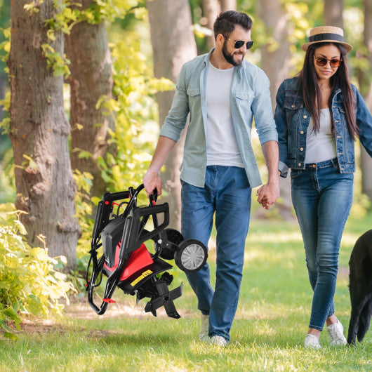 —� Convenient Storage: With rotary knobs on two positions of the frame the tiller cultivator can be folded into a compact size. Just leave it in a small corner of the utility room after your gardening work! What's more wheels can be opened downward for easy transportation.