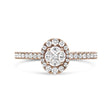 A confident expression of love, this diamond engagement ring ensures a marvelous moment. Created from deep hued 18K rose gold, this bold style showcases a stunning diamond look. 4 marquise shaped diamonds close on a center round diamond to give the impression of a much larger, solitaire round diamond. A halo of round diamonds surrounds this centerpiece and come together to form an oval-shaped diamond composite. Smaller paired diamonds are set along the shank for added sparkle. Finally, hidden under the head are miglrain leafs. Radiant with 1/2 cts. t.w. of diamonds and a brilliant buffed luster, this engagement ring suits her glamorous taste.