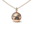 Cast in polished 18k rose gold, this ball drop pendant necklace showcases a design that is rich in symbolism. A single row of diamond-encrusted filigree heart silhouettes spread out around the perimeter of the ball, declaring a statement of love. The diamond clusters on the hearts alternate between black and white colors for an attention-grabbing sparkle. White diamonds also line the bail that enhances the overall dazzle. This hollow ball pendant necklace elegantly suspends from an 18" rope chain and secures around the neck with a spring ring clasp. The diamonds cast their gleam in a total 3/8 cttw with an approximate black and G-H Color with SI1-SI2 Clarity.
