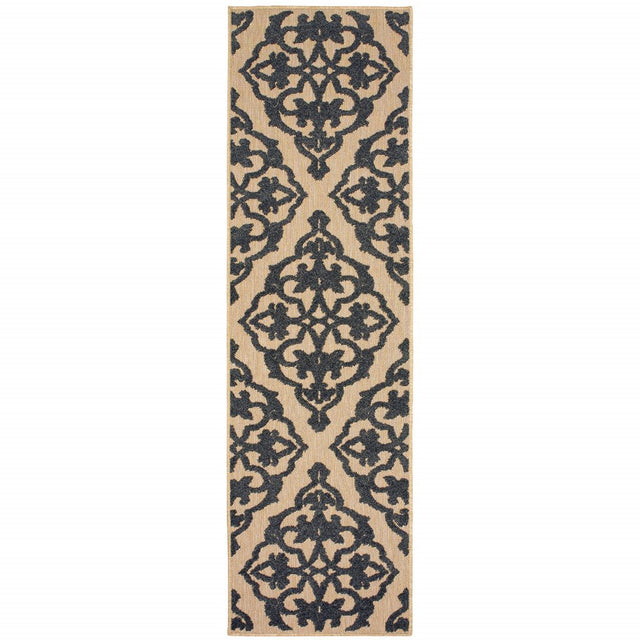 2' X 8' Beige and Black Oriental Stain Resistant Indoor Outdoor Area Rug