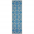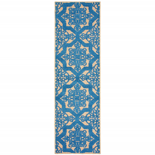 2' X 8' Blue and Beige Oriental Stain Resistant Indoor Outdoor Area Rug