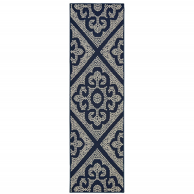 2' X 8' Blue and Ivory Geometric Stain Resistant Indoor Outdoor Area Rug