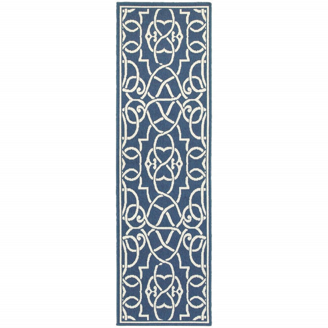2' X 8' Blue and Ivory Geometric Stain Resistant Indoor Outdoor Area Rug