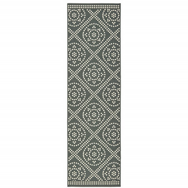 2' X 8' Gray and Ivory Geometric Stain Resistant Indoor Outdoor Area Rug