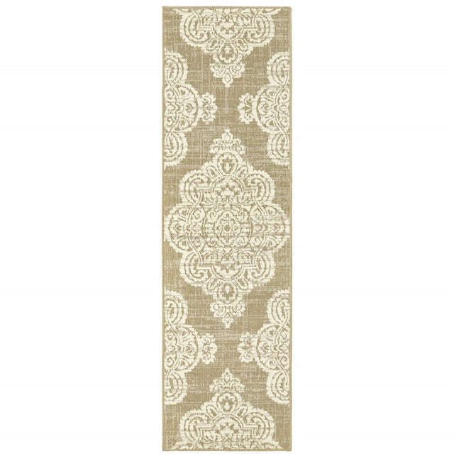 2' X 8' Tan Oriental Stain Resistant Indoor Outdoor Area Rug