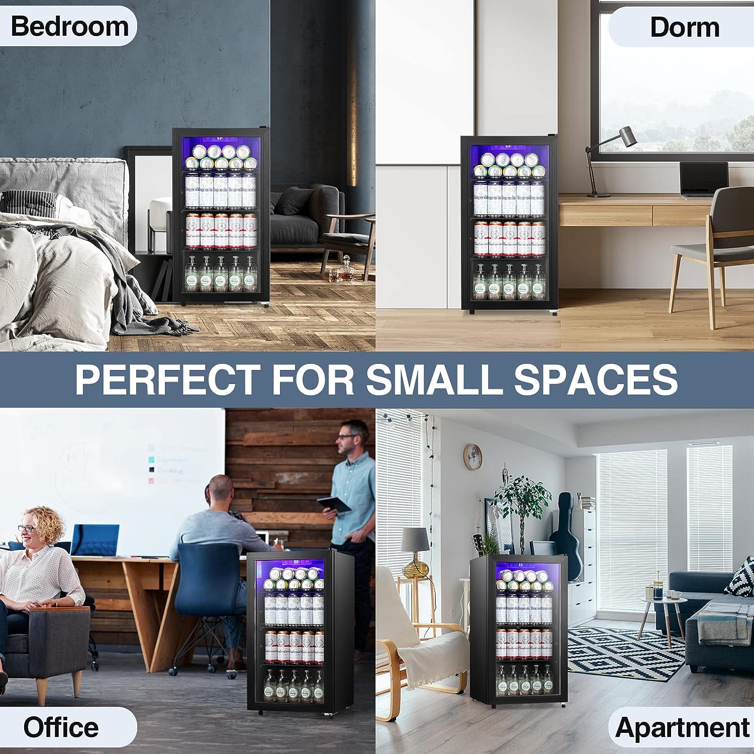 【Compact Beverage Refrigerator】17.52 × 18.50 × 32.68 inches mini refrigerator. It has a capacity of 3.2 Cu. Ft. It can store a variety of canned beverages or wine without taking up too much space in your home, dorm, bar or office. The compact design can meet your needs.