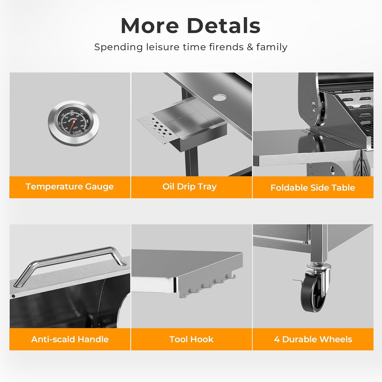 - 【Unique Design】The unique stainless steel surface adds style and durability to the grill. The double-layered lid ensures excellent insulation, keeping the food delicious and evenly heated. The built-in temperature gauge allows for real-time monitoring of the temperature. The grill is equipped with 4 galvanized wheels for easy transportation.