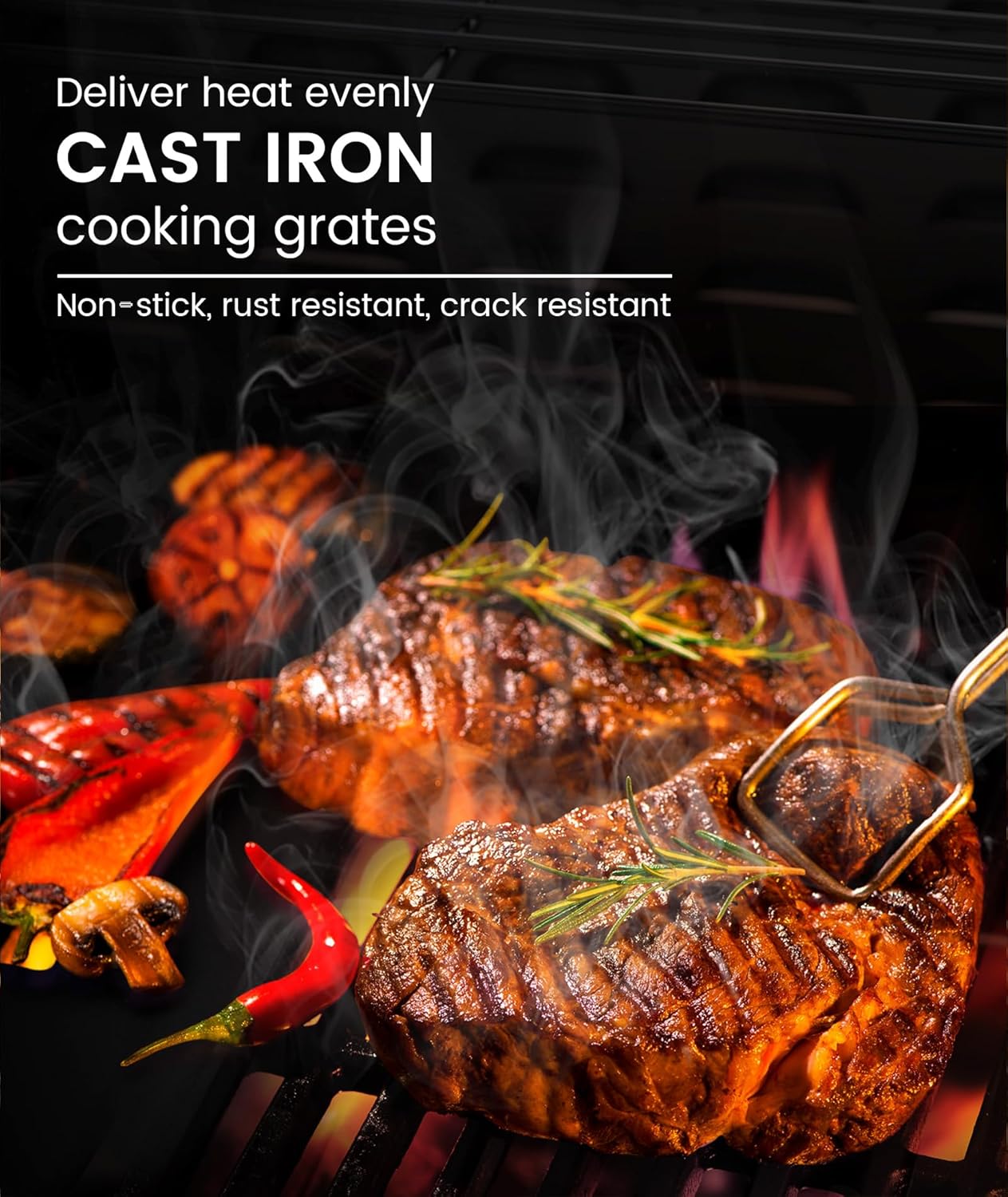 - 【Porcelain-Coated Cast Iron Grates】The cooking grates are made of durable and easy-to-clean porcelain-coated cast iron material, helping prevent rusting and cracking. The stainless steel burners, porcelain-coated cast iron grates, and porcelain flame tamers work together to distribute heat evenly across the grilling surface.