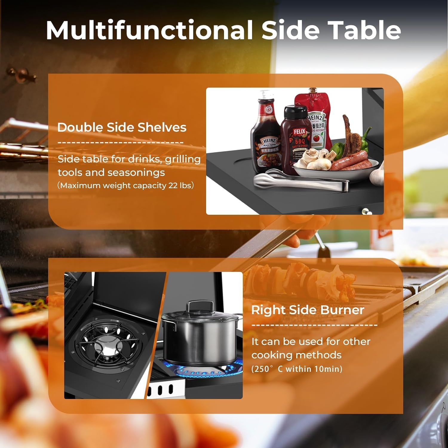 【More Convenient and Safer】The handle has widened the distance from the furnace cover, which improves safety and prevents hands from being burned. Made of stainless steel, it has a more advanced appearance and is more convenient to clean. Condiments and grilling tools can be placed on both sides of the grill.