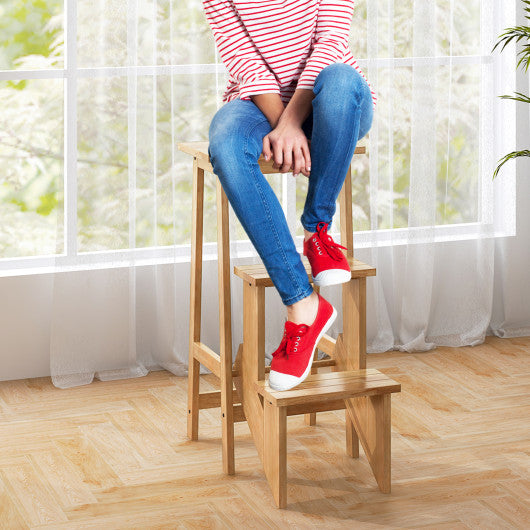3-in-1 Rubber Wood 3 Tier Folding Step Stool Ladder Storage Shelf-Natural