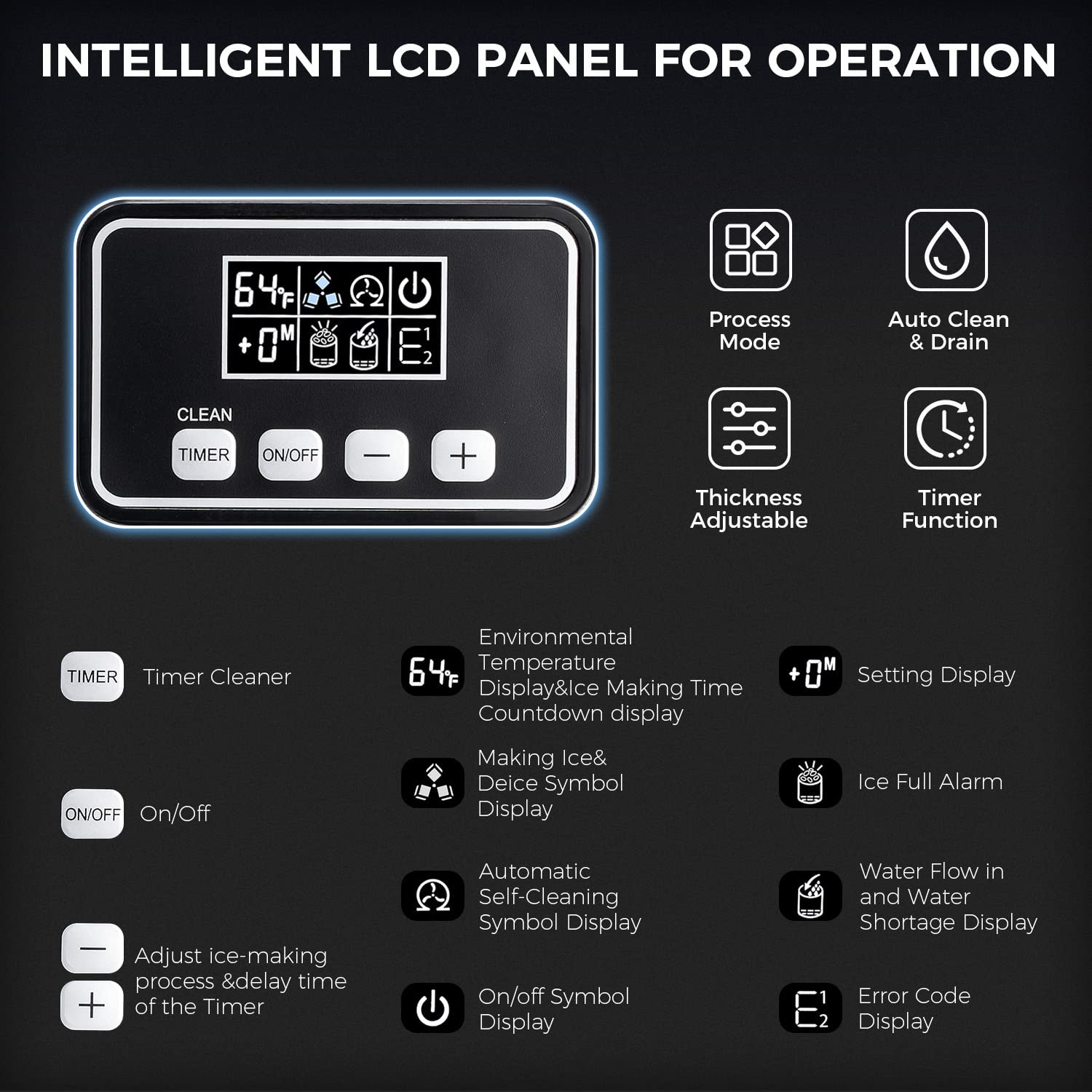 - 【Touch Screen Operation & Powerful Functions】Equipped with an advanced LCD digital panel with a touch screen, the ice making process is clearly displayed and the ice making status can be adjusted. You can adjust your ice making time and ice thickness to suit your needs, or you can turn on the auto-clean and auto-drain functions to organize your ice maker.