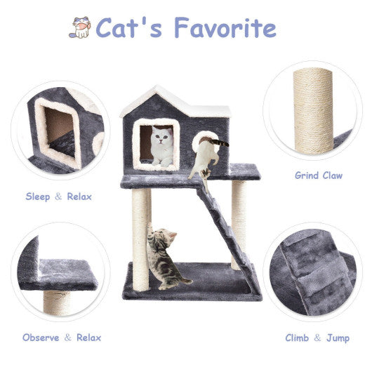 The cat tree is suitable for kittens. this cat tree has a strong bearing capacity and high stability. The sisal rope which is covering the cat post not only can prevent the cat condo shaking but also can be used for the cat scratch so that your fabric sofa wooden furniture and shoes can escape from being scratched. Featuring two levels and one big room the cat tree makes it a comfortable spot for your cat or kitten to rest and relax.