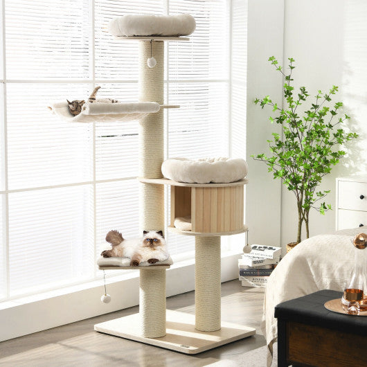 4-Layer 68.5-Inch Wooden Cat Tree Condo Activity Tower with Sisal Posts-Natural