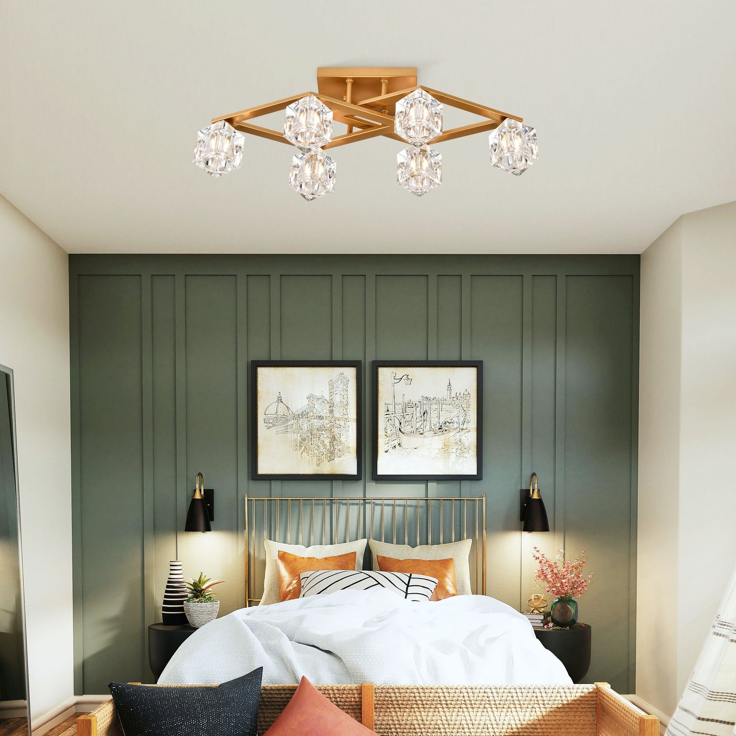 6 Light Crystal Ceiling Light For Dining Room, Modern Ceiling Lamp With Light Fixture For Entryway, Lobby, Kitchen, Bedroom, Living Room, Conference Room, (6*G9 Bulbs Included) - Gold