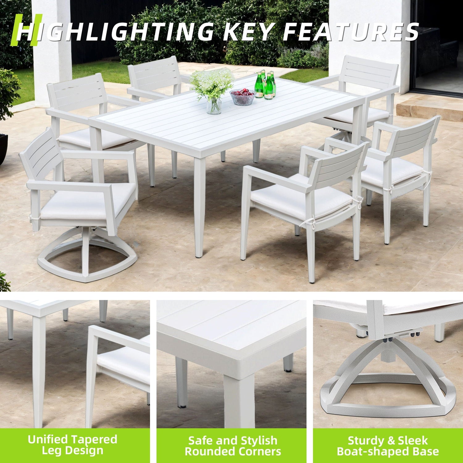 7 Piece Dining Set Modern Outdoor Patio Furniture, Including 4 Dining Chairs & 2 Swivel Rockers Sunbrella Fabric Cushioned And Two-Tone Rectangle Table With Umbrella Hole - Matte White / Grayish