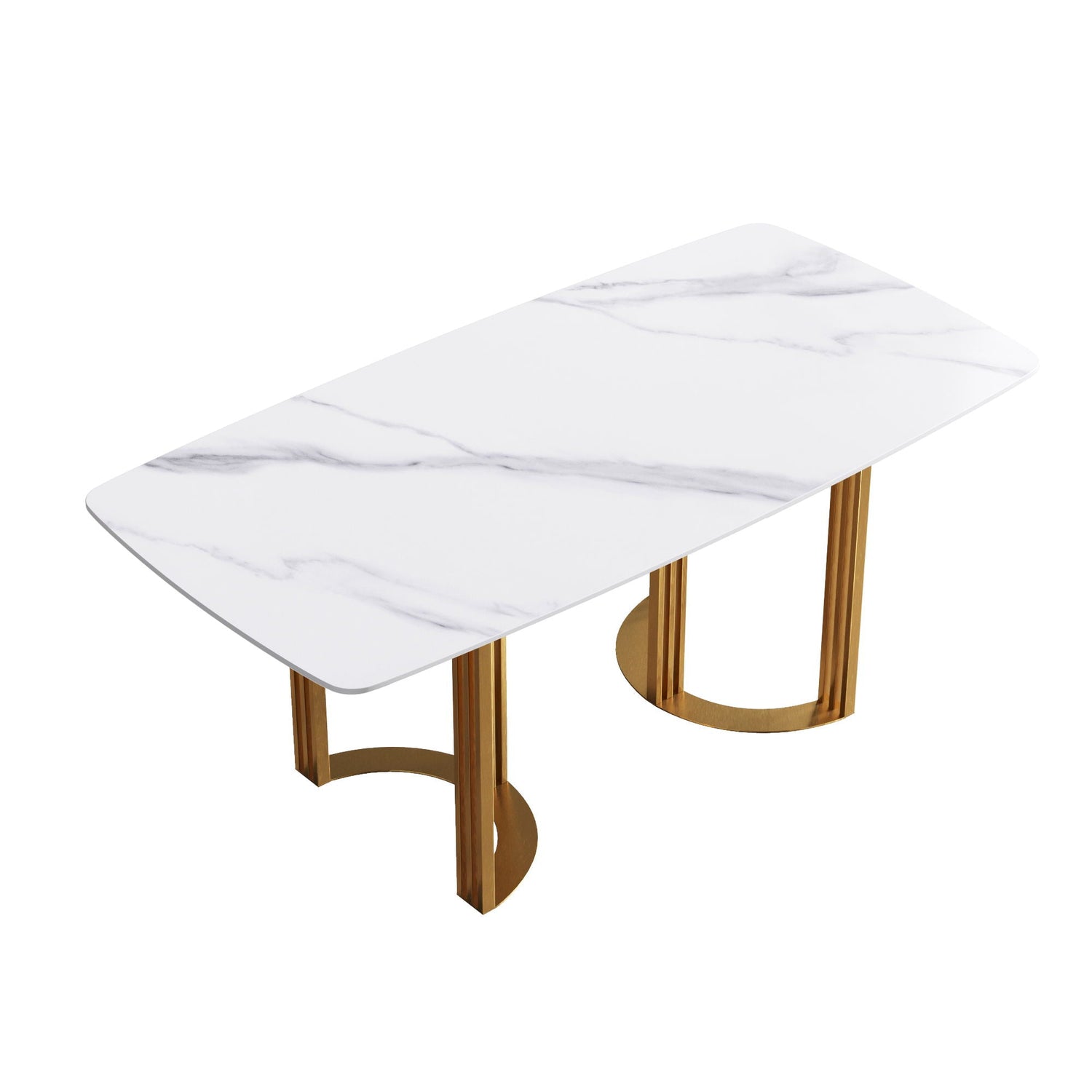 70.87" Modern Artificial Stone White Curved Golden Metal Leg Dining Table, Can Accommodate 6-8 People - White / Gold