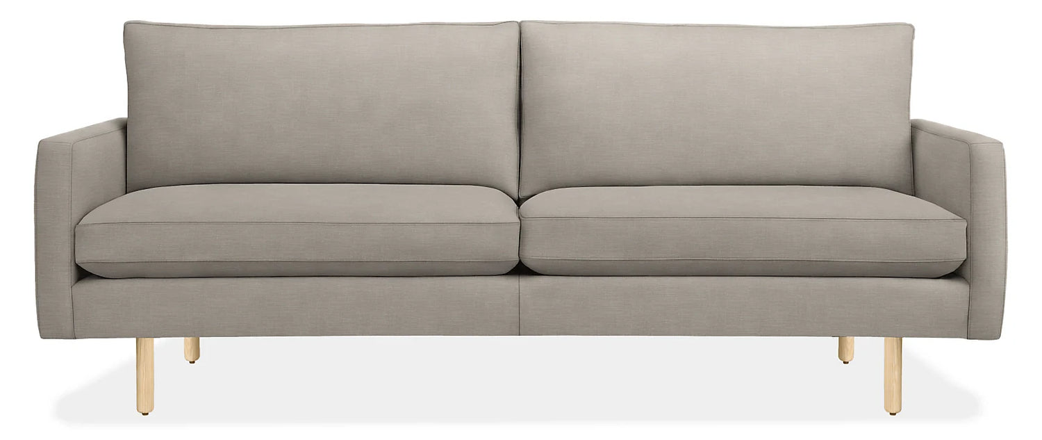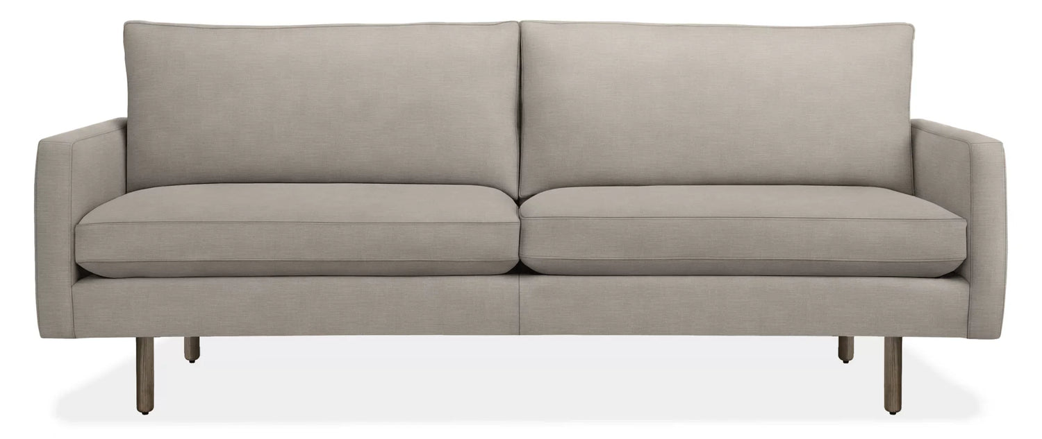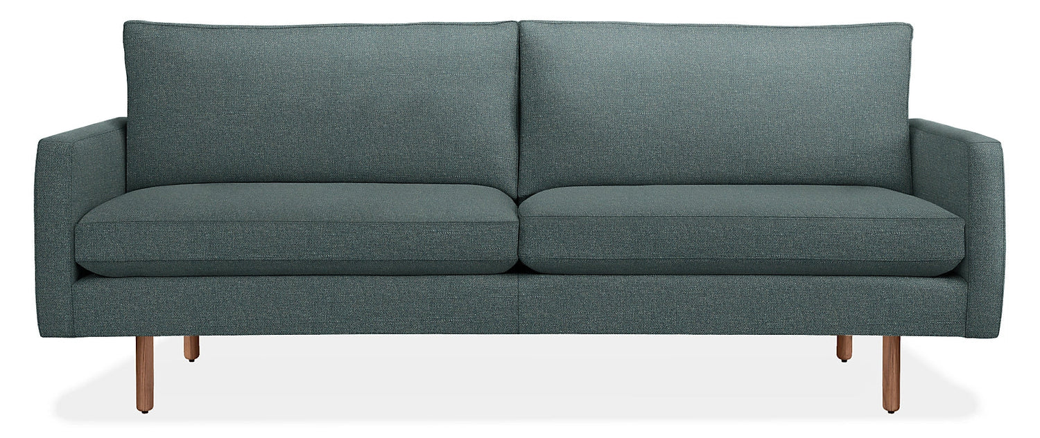 The Jasper Sofa combines mid-century style with modern comfort, perfect for any living space. Featuring a compact yet spacious design, this sofa includes narrow arms to maximize seating and elegant walnut-finished wood legs for a light, elevated profile. With plush blend-down cushions, this sofa offers a soft, sink-in feel and medium seat depth, providing universal comfort and easy access at a seat height close to that of a dining chair. Handcrafted in North Carolina using responsibly sourced materials, Jasper ensures both durability and comfort. The fabric, Tepic haze (Bouclé), is family and pet-friendly, offering fade resistance for lasting appeal. Certified CertiPUR-US® foam and sustainably sourced wood underscore the sofa's commitment to quality. Jasper’s design is ideal for smaller spaces, delivering high style without overwhelming your room. Experience the Jasper Sofa's premium build, responsibly made for lasting comfort and elegance.