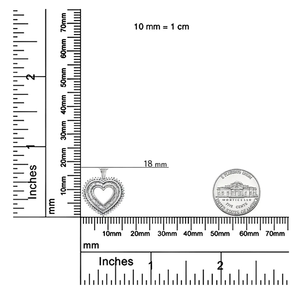 Sparkling with an impressive array of 1.0 cttw diamonds, this open heart pendant necklace for her is a beautiful illustration of love and romance. The interior of the heart is intricately lined by glittering baguette diamonds in a channel-setting, while the outer portion of the pendant balances the look with a frame of prong-set white diamonds. These diamonds are of an approximate H-I color and I3 clarity and accompanied by fine .925 sterling silver. The contemporary yet classic 18" box chain complements any neckline beautifully and secures with a spring ring clasp.