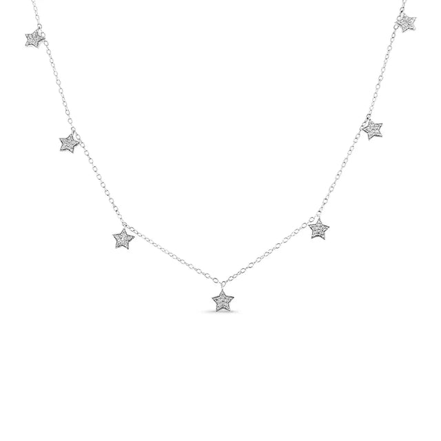 Set your sights to the sky with this heavenly multi-star dangle droplet pendant necklace. This celestial pendant necklace is adorned with multiple star silhouettes, each set with clusters of glimmering prong-set diamonds for a total 1/3 cttw of an approximate I1-I2 clarity and H-I color. This .925 sterling silver necklace features a tarnish-resistant micron plating preventing corrosion for beautiful longevity of the piece. The contemporary 18" rope chain complements any neckline beautifully and secures with a spring ring clasp.