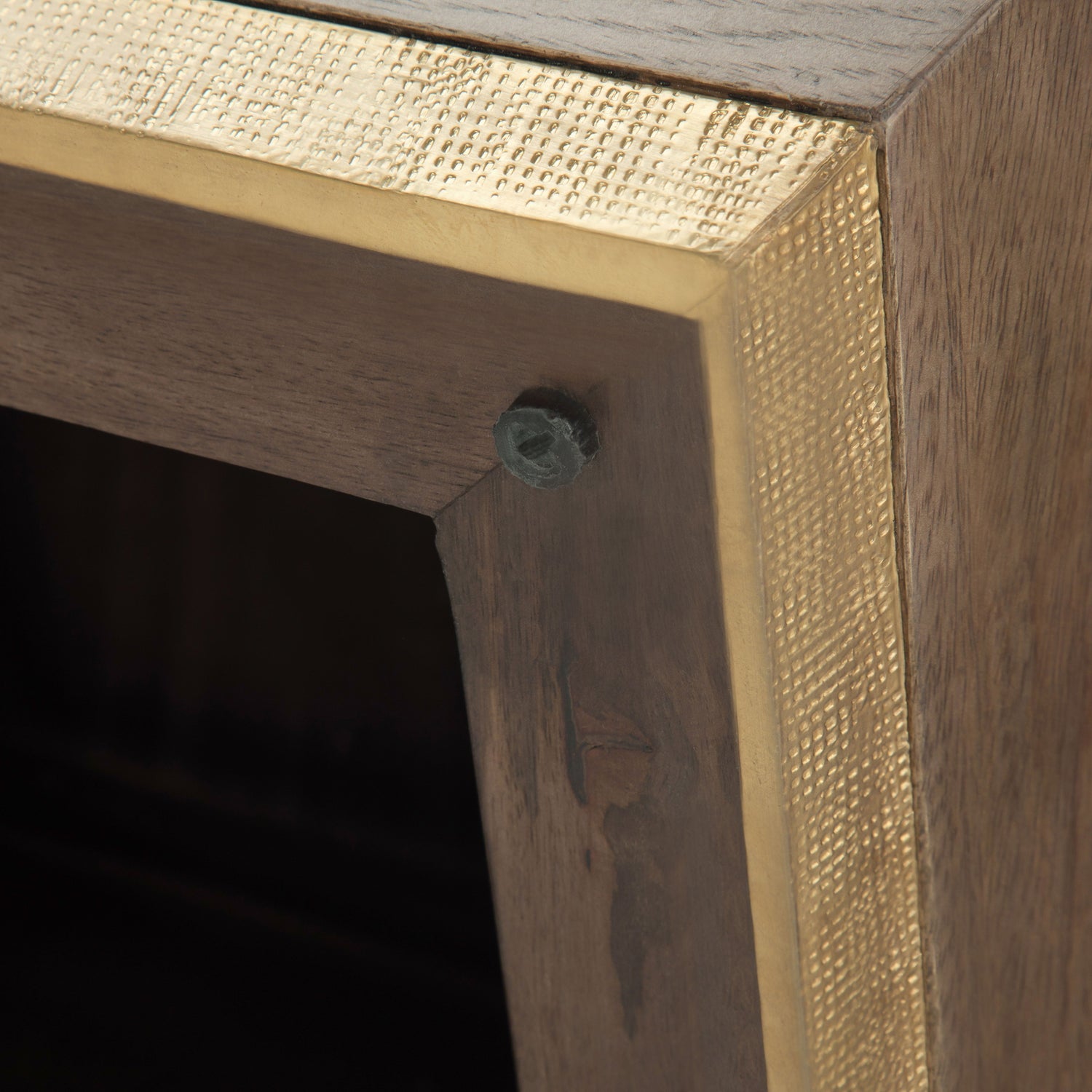 - Features spacious square table top with tapered angle base and brass accent trim at table base