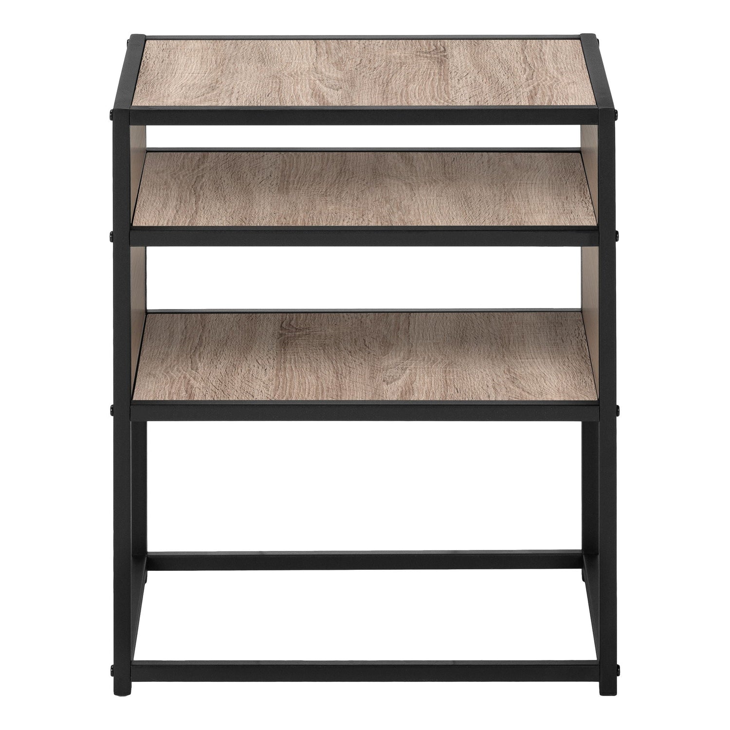 - Design and Material: The 3-tier accent table features a sleek black metal frame paired with a wood-look tabletop, shelves, and side panels in a dark taupe finish. The wood-grain texture adds a touch of elegance, making it a stylish addition to any room.