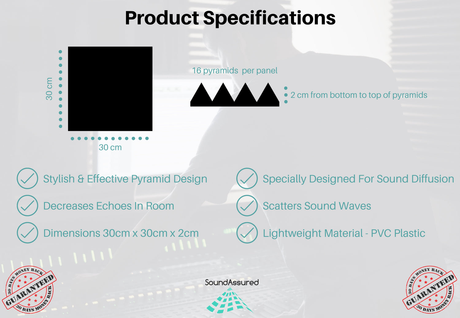 Diffusers are often used in combination with sound absorbing panels and bass traps in order to get the desired sound in your room. Small, modular size of these acoustic diffusers allows for placement between our 12x12" acoustic foam panels.