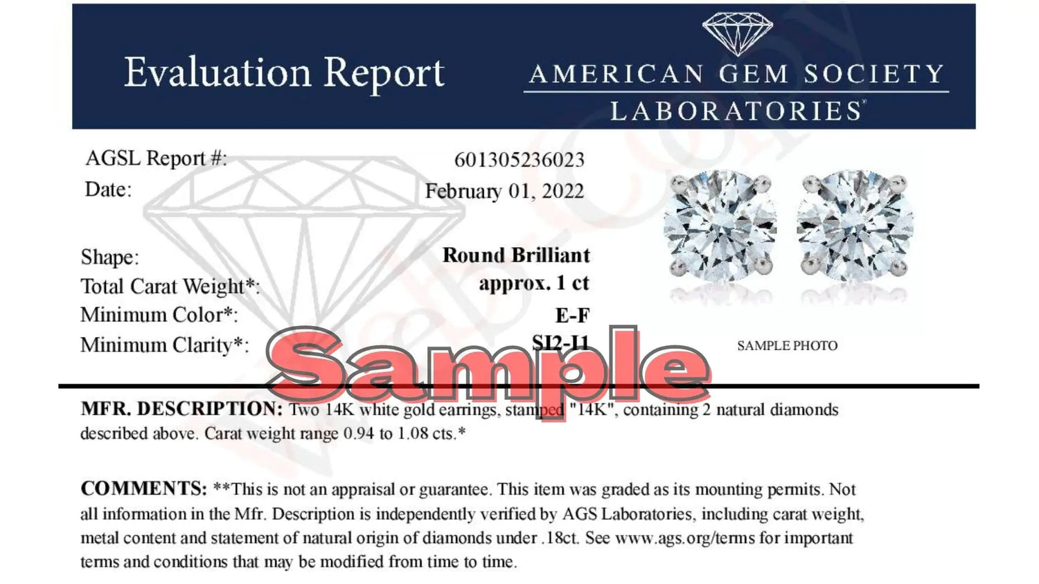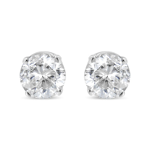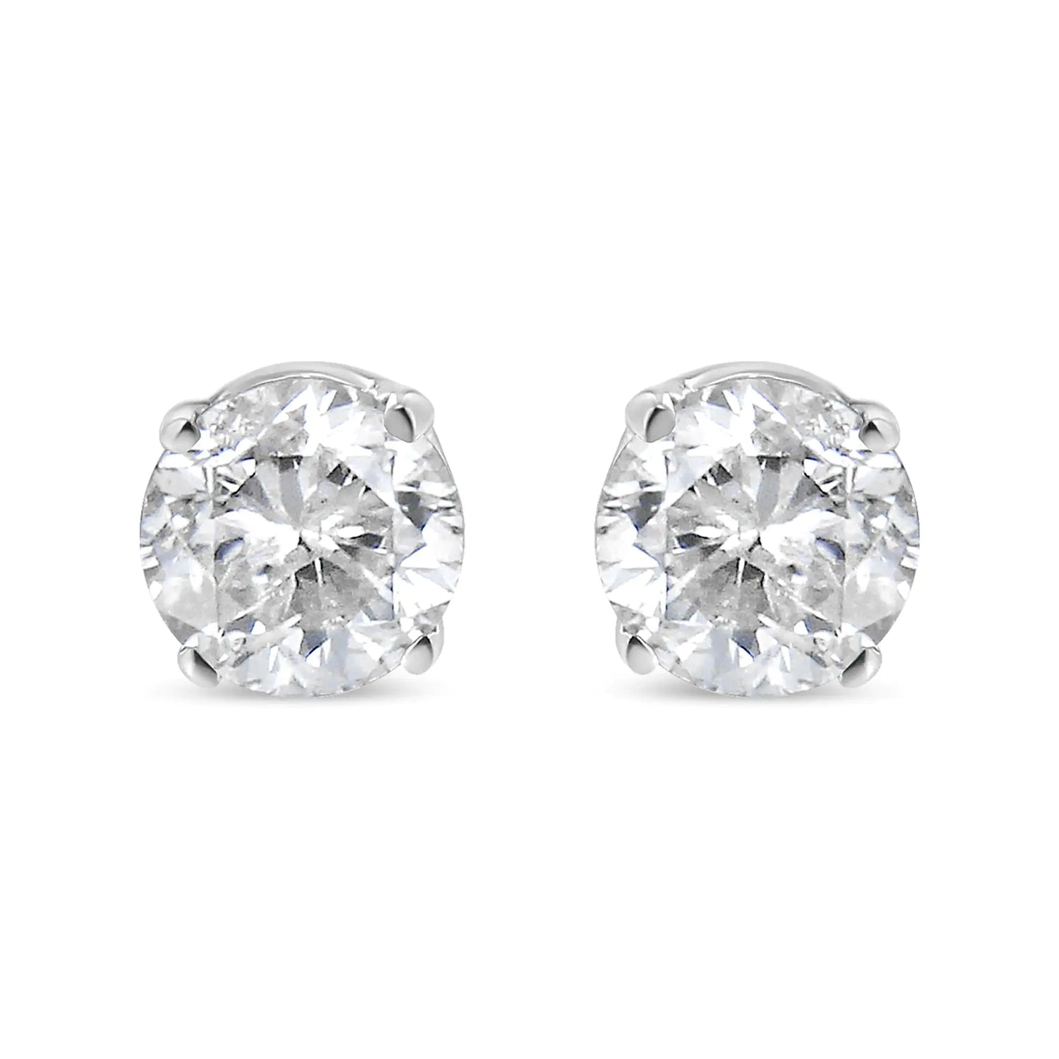 Celebrate any occasion with these classic shimmering diamond stud earrings. Crafted from 14k white gold each earring showcases a sparkling brilliant round-cut solitaire diamond in a 4-Prong Setting. Dazzling with 1.0 cttw of diamonds and a bright polished shine, these push back stud earrings secure comfortably on your ear. These diamond studs are certified by the AGS as natural, earth mined diamonds. These diamonds are color rated as E-F color, and clarity graded as SI2-I1 clarity. Make these classic diamond studs yours today!